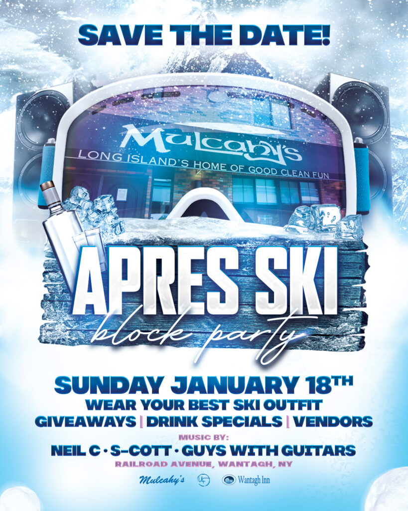 The 1st Wantagh Apres Ski Block Party Sunday, January 18th on Railroad Avenue. Don't miss Drink specials, giveaways , vendors. Live music by the great "Guys with Guitars" followed by DJ Neil C