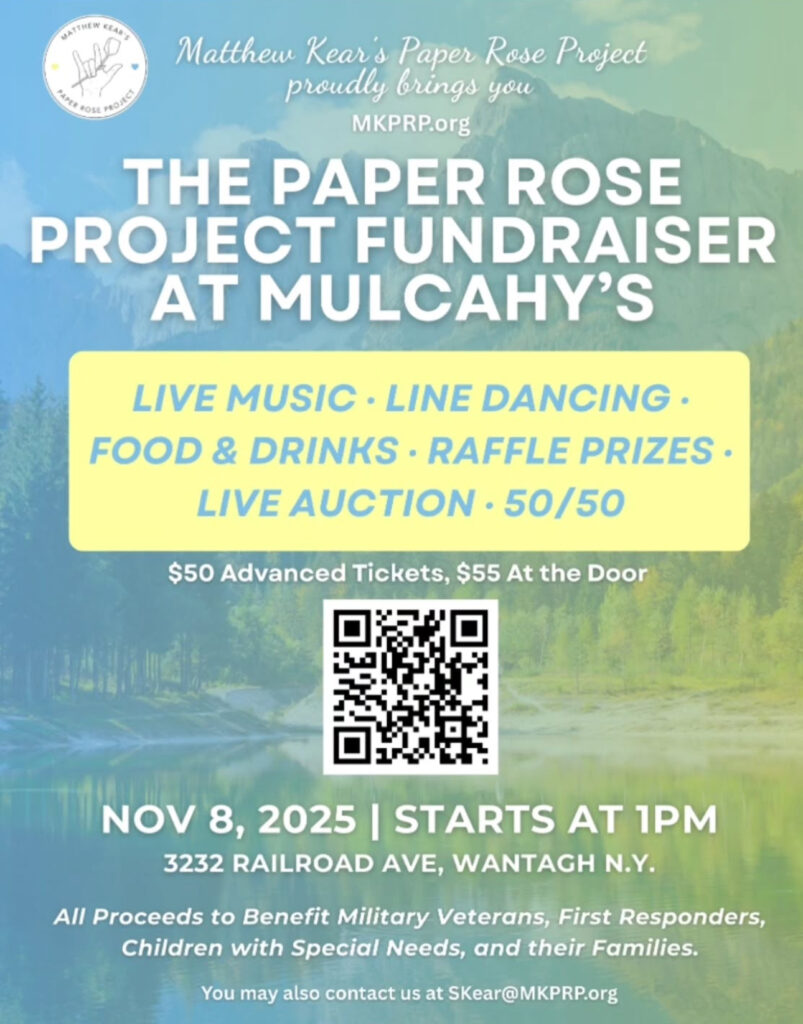 Matthew Kear's Paper Rose Project proudly presents The Paper Rose Project Fundraiser: includes live music, line dancing, food & drinks, raffle prizes, live auction and 50/50. All proceeds to benefit Military Veterans, First Responders, Children with Special Needs and their families. Tickets available at the door for $55 / or $50 when you buy in advance via the givebutter link.