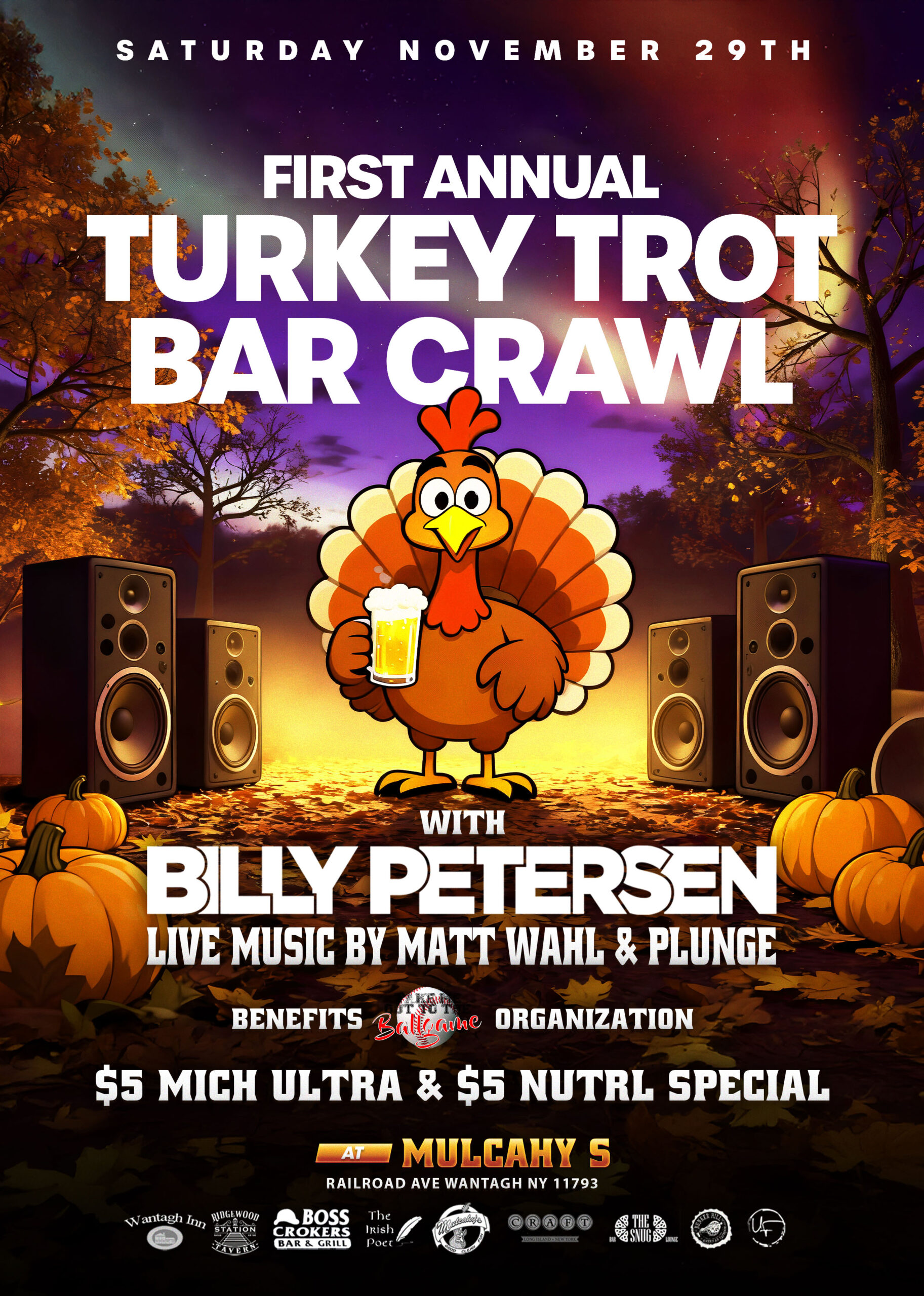 First Annual Turkey Trot Takes over Wantagh this Week! $5 Mich Ultra and $5 Nutrl Specials Live music by PLUNGE & DJ Billy Peterson 50/50 Raffle to benefit "Take me out to the Ball Game" local fundraiser. Check your favorite local bars for their start time and specials!